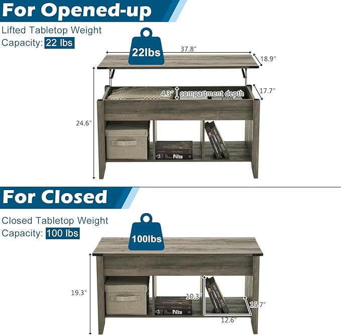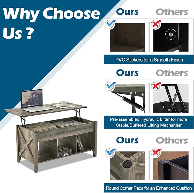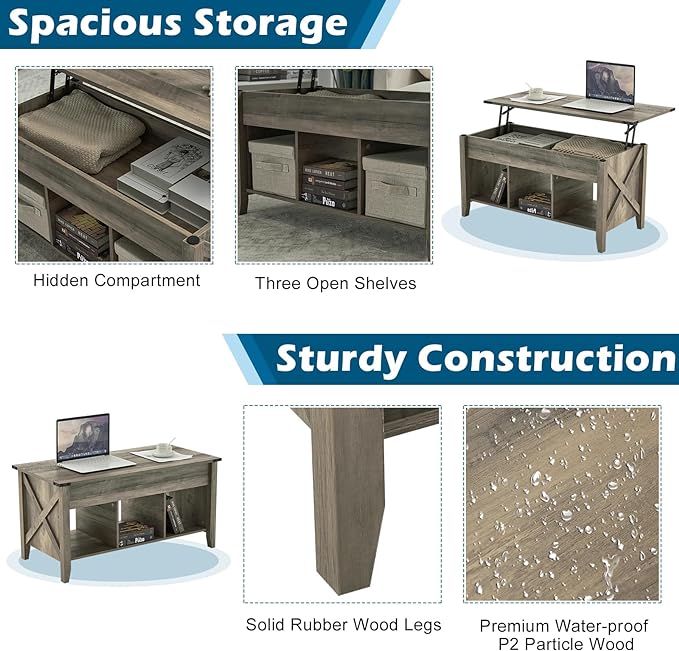 VINGLI Farmhouse Lift Top Coffee Table, Rustic Grey Coffee Table with Lift Top, Lift Up Pop Up Coffee Table with Storage Shelf/Hidden Compartment, Gas Lift Coffee Table Mesa De Centro Para Sala