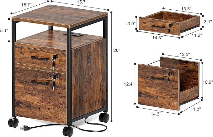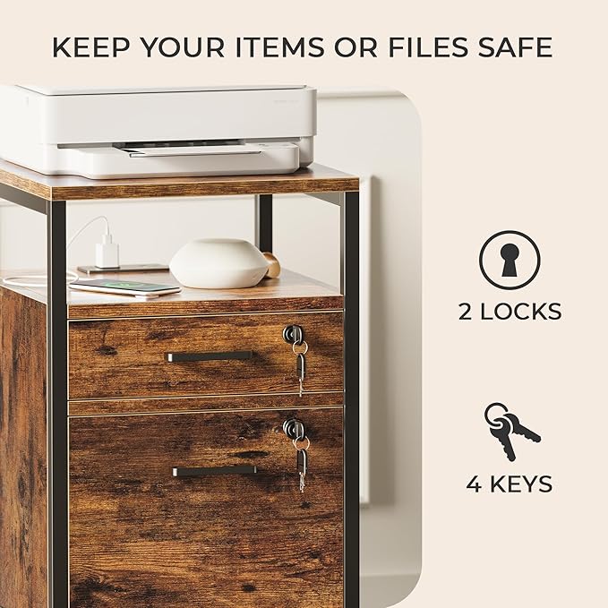 SUPERJARE File Cabinet with Lock & Charging Station, 2 Drawers Rolling Filing Cabinet, Office File Cabinet with Wheels & Open Shelf, for Home Office, A4/Letter Size Files - Rustic Brown