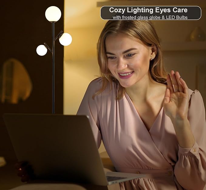 3 Globe Modern Black Floor Lamp, Mid Century Contemporary Standing Lamp with Sphere Frosted Glass Shade and Warm White LED Bulbs, LED Tall Pole Tree Lamp for Living Room, Bedroom, Hotel
