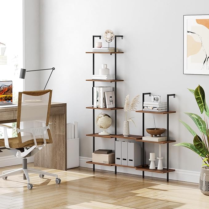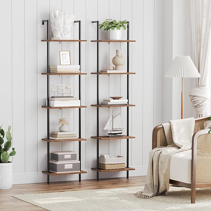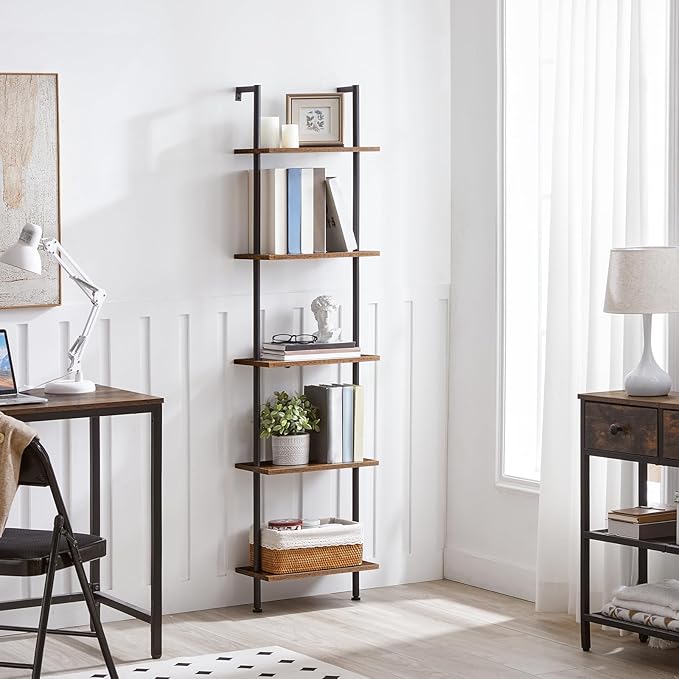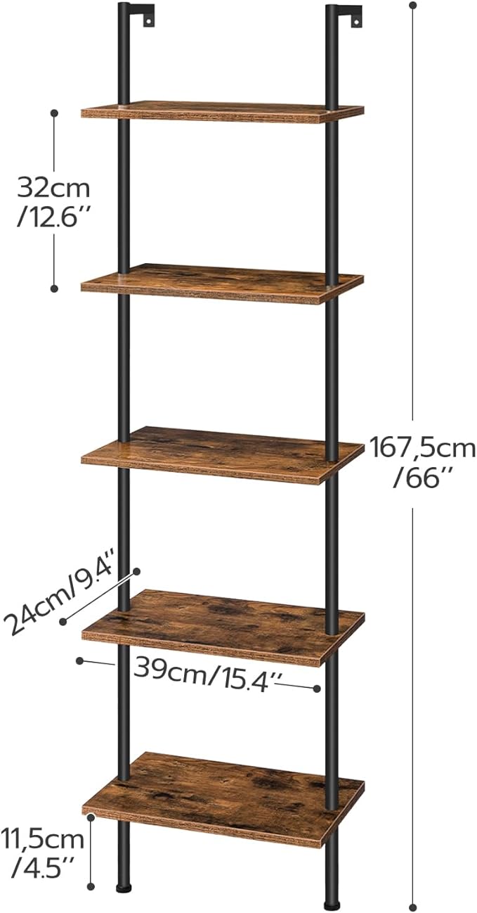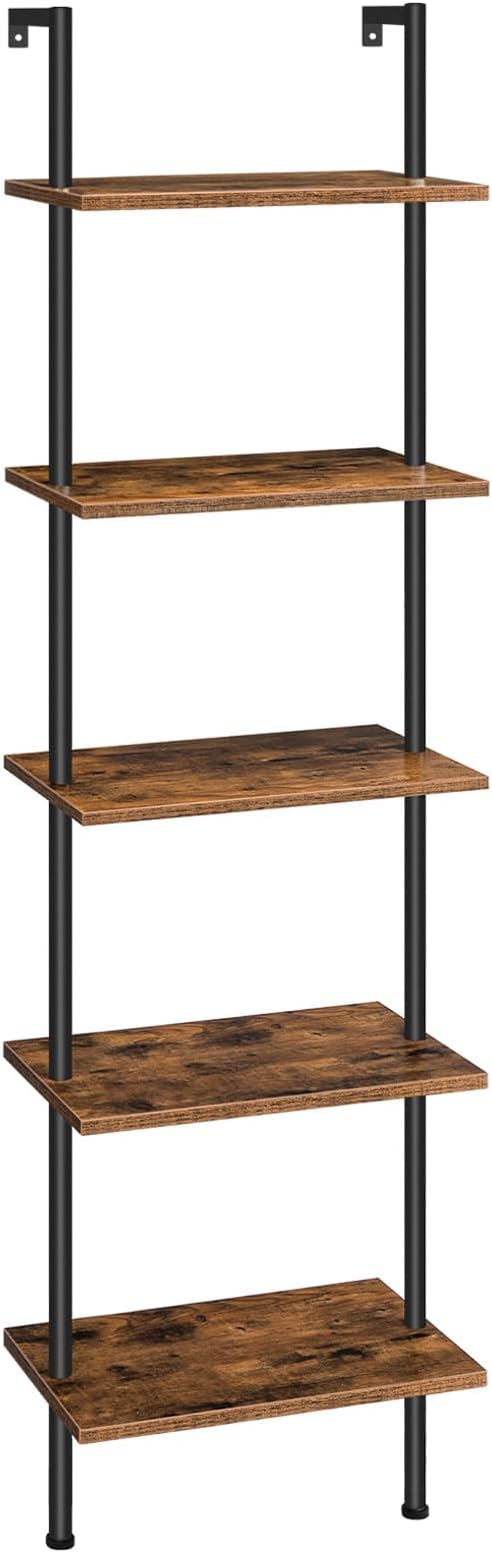 HOOBRO DIY Ladder Shelf, 5-Tier Wooden Wall Mounted Bookshelf, Narrow Bookcase, Display Shelf, Storage Rack, Plant Stand, for Living Room, Bedroom, Study, Balcony, Rustic Brown and Black BF531CJ01