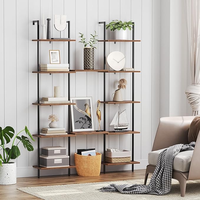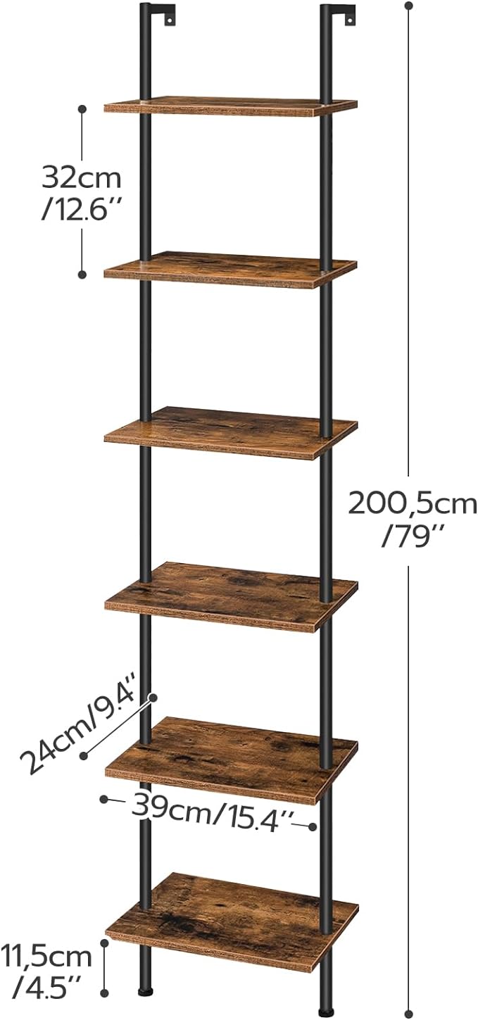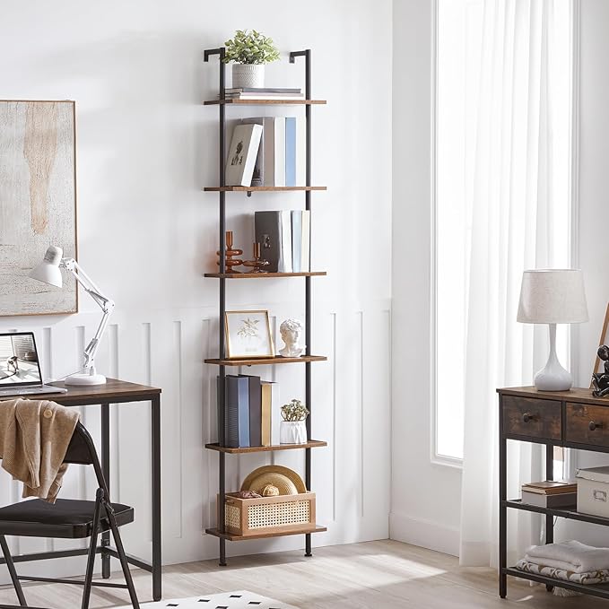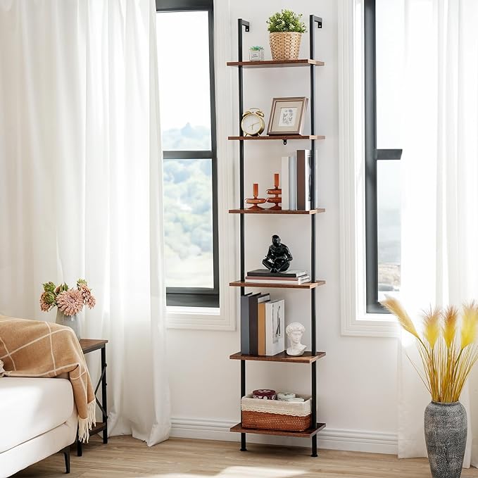 HOOBRO DIY Ladder Shelf, 6-Tier Wooden Wall Mounted Bookshelf, Narrow Bookcase, Display Shelf, Storage Rack, Plant Stand, for Living Room, Bedroom, Study, Balcony, Rustic Brown and Black BF651CJ01