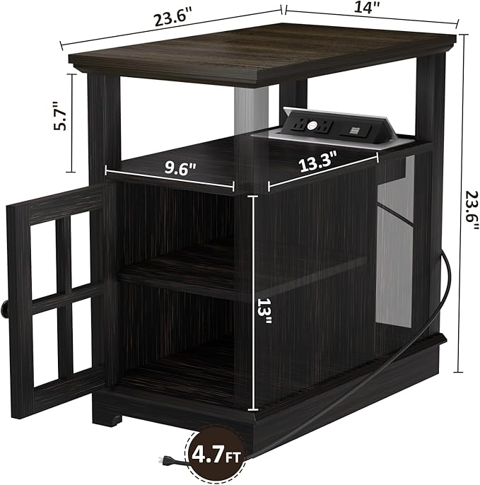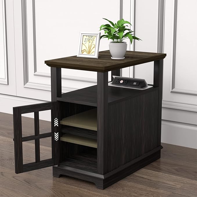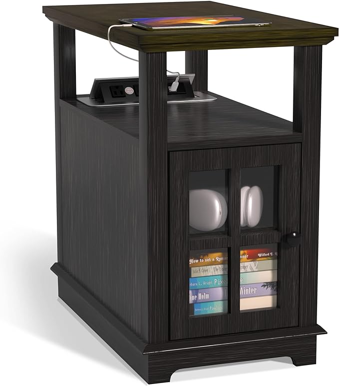 HIFYOBRO End Table with Hidden Charging Station, Narrow Side Table with Storage, Nightstand for Small Spaces with USB Ports & Power Outlets