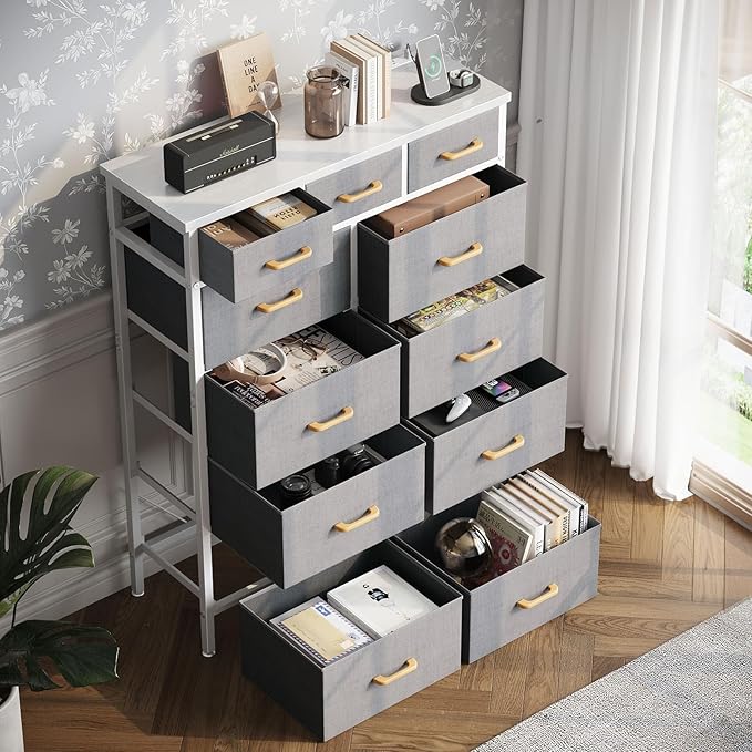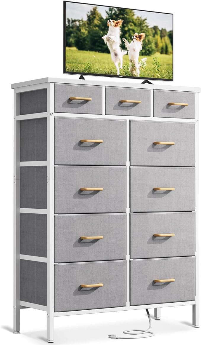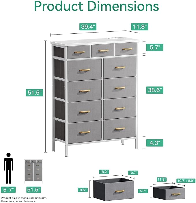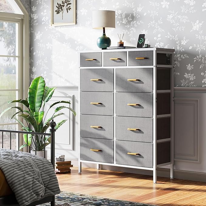 AODK Dresser with Charging Station, 52 Inches Tall Dresser for Bedroom with 11 Storage Drawers, Large Fabric Dressers for Living Room, Hallway, Light Grey