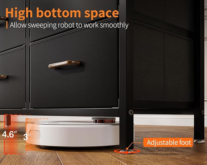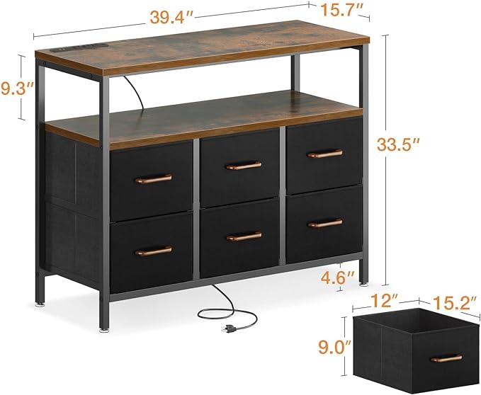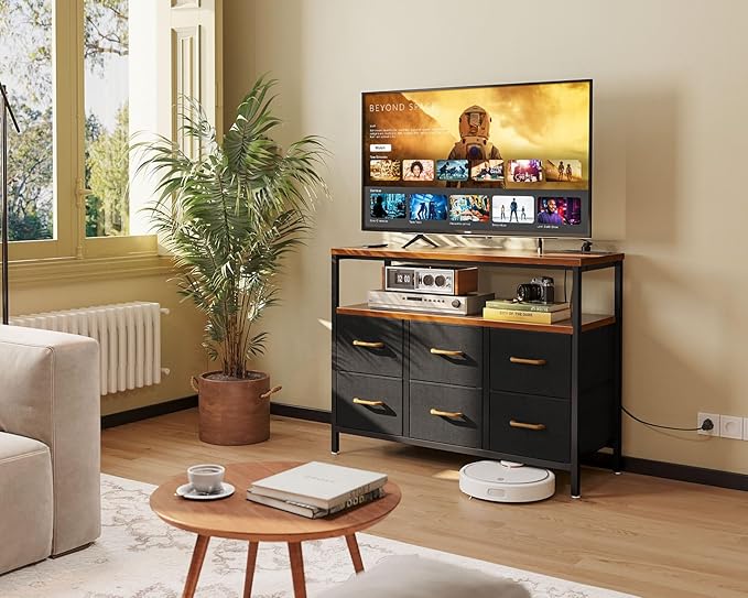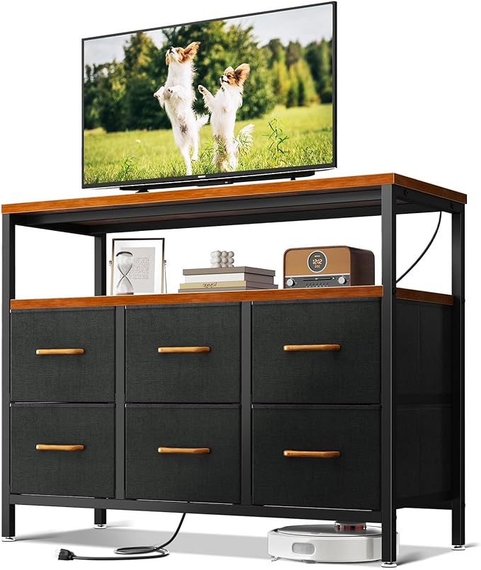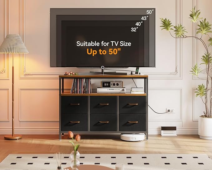 AODK TV Stand with Power Outlet, 40" Long TV Stand with 6 Large Fabric Drawers, Entertainment Center with Open Shelves for 55 Inch TV, Living Room, Black and Vintage