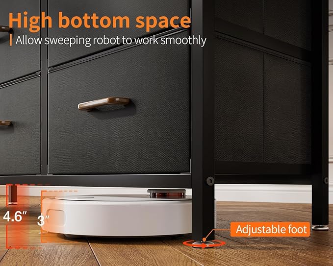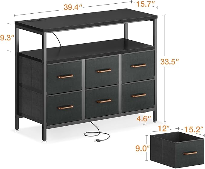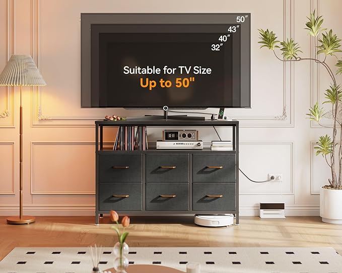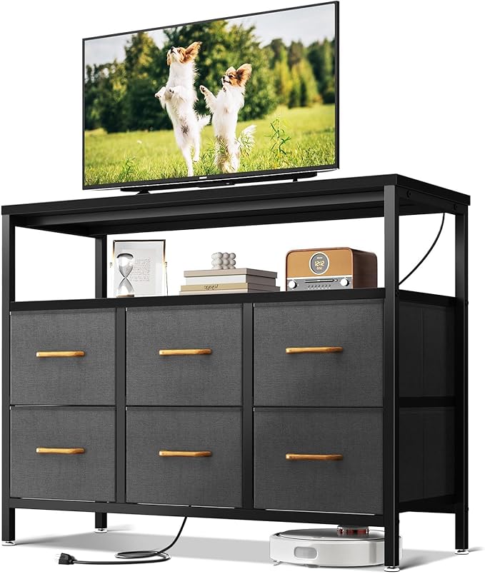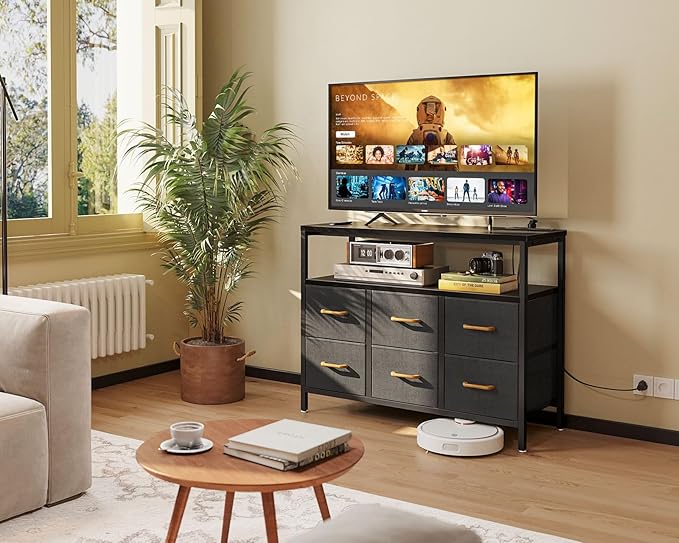 AODK TV Stand with Power Outlet, 40" Long TV Stand with 6 Large Fabric Drawers, Entertainment Center with Open Shelves for 55 Inch TV, Living Room, Black and Dark Grey