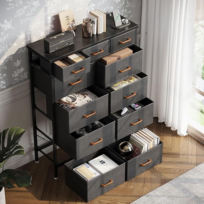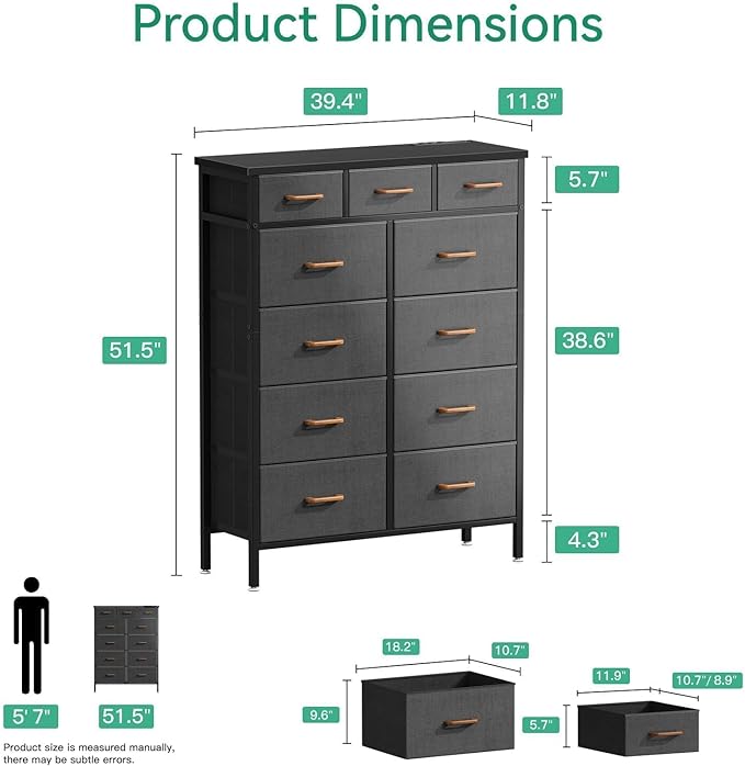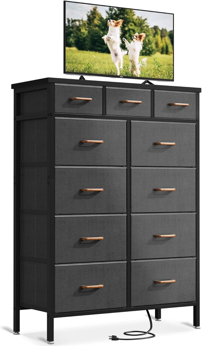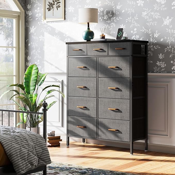 AODK Dresser with Charging Station, 52 Inches Tall Dresser for Bedroom with 11 Storage Drawers, Large Fabric Dressers for Living Room, Hallway, Dark Grey