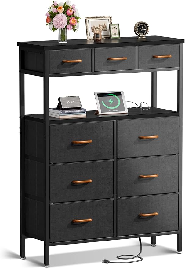 AODK Dresser with Charging Station, 52 Inches Tall Dresser for Bedroom with 9 Storage Drawers, Large Fabric Dressers for Living Room, Hallway, Dark Grey