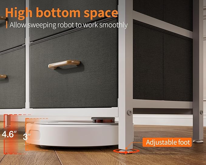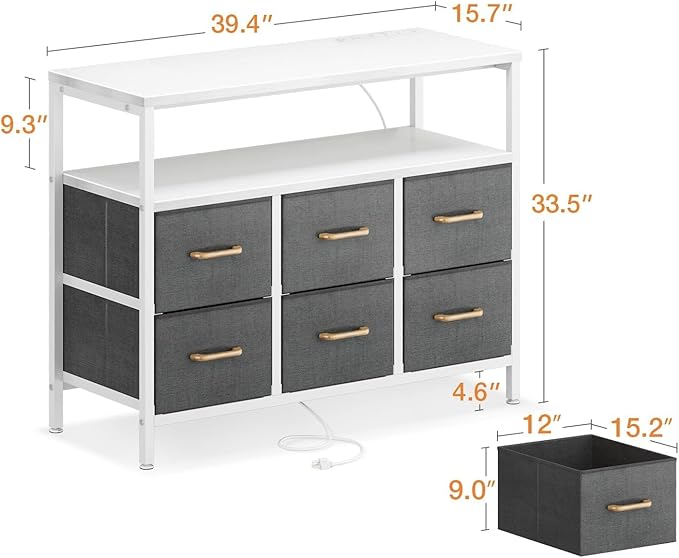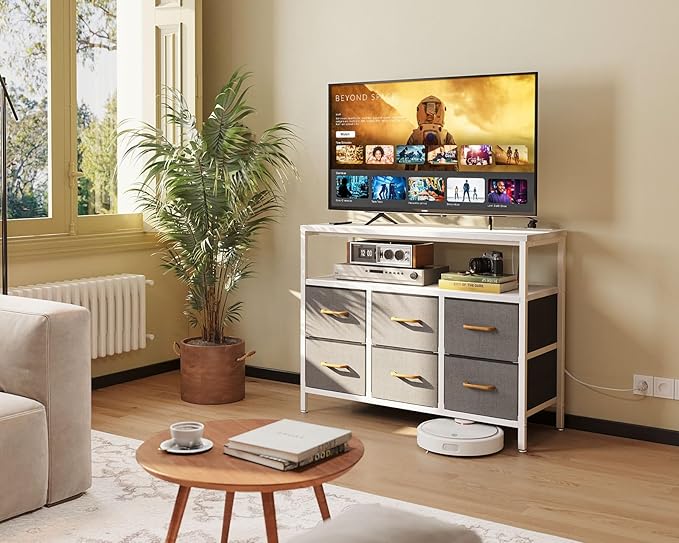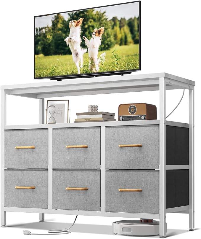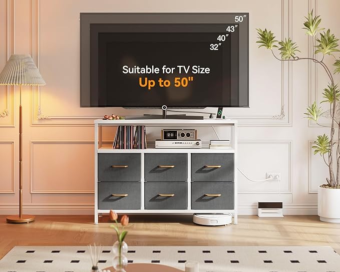 AODK TV Stand with Power Outlet, 40" Long TV Stand with 6 Large Fabric Drawers, Entertainment Center with Open Shelves for 55 Inch TV, Living Room, White and Light Grey
