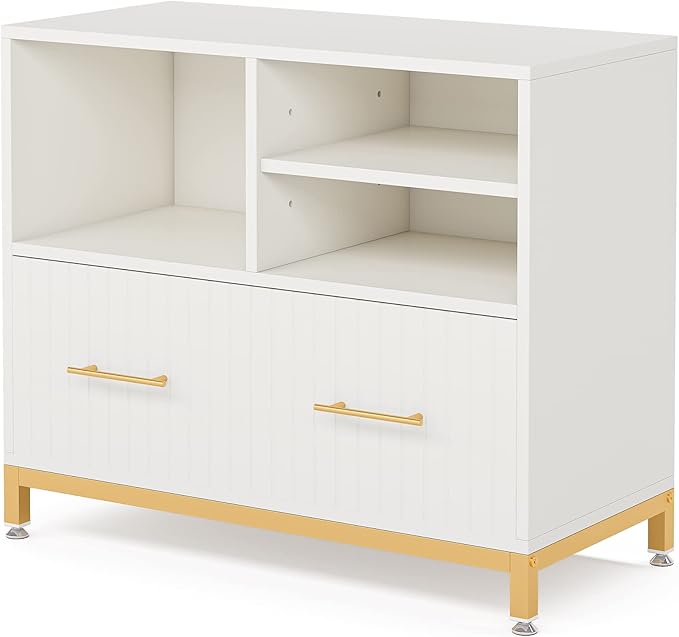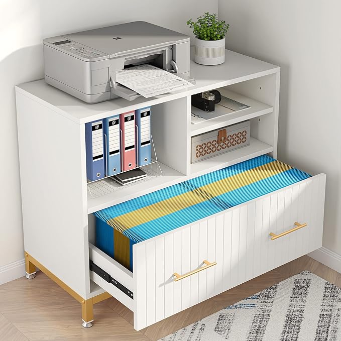 White Lateral File Cabinet with Drawer, 35.4" Modern Filing Cabinet with Adjustable Hanging Rod for Legal/Letter/A4 Size Files, Wood Printer Stand with Open Storage Spaces for Home Office