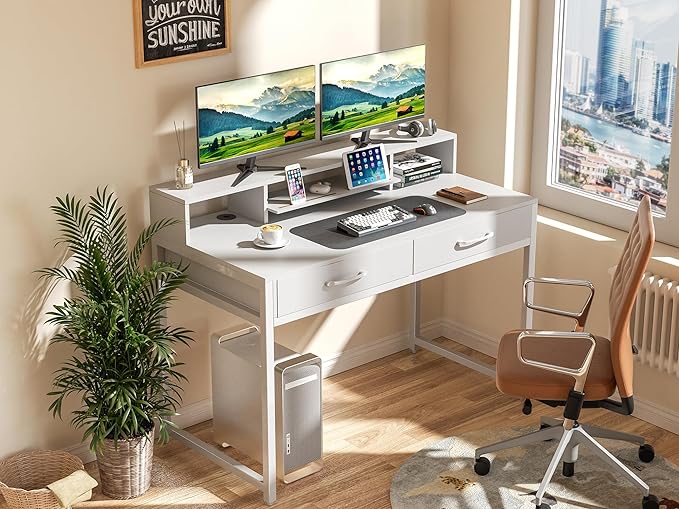 Computer Desk with Drawers, 47" Home Office Desk with Monitor Shelf, Writing Desk with Storage, Gaming Desk Work Desk Study Desk for Bedroom, White