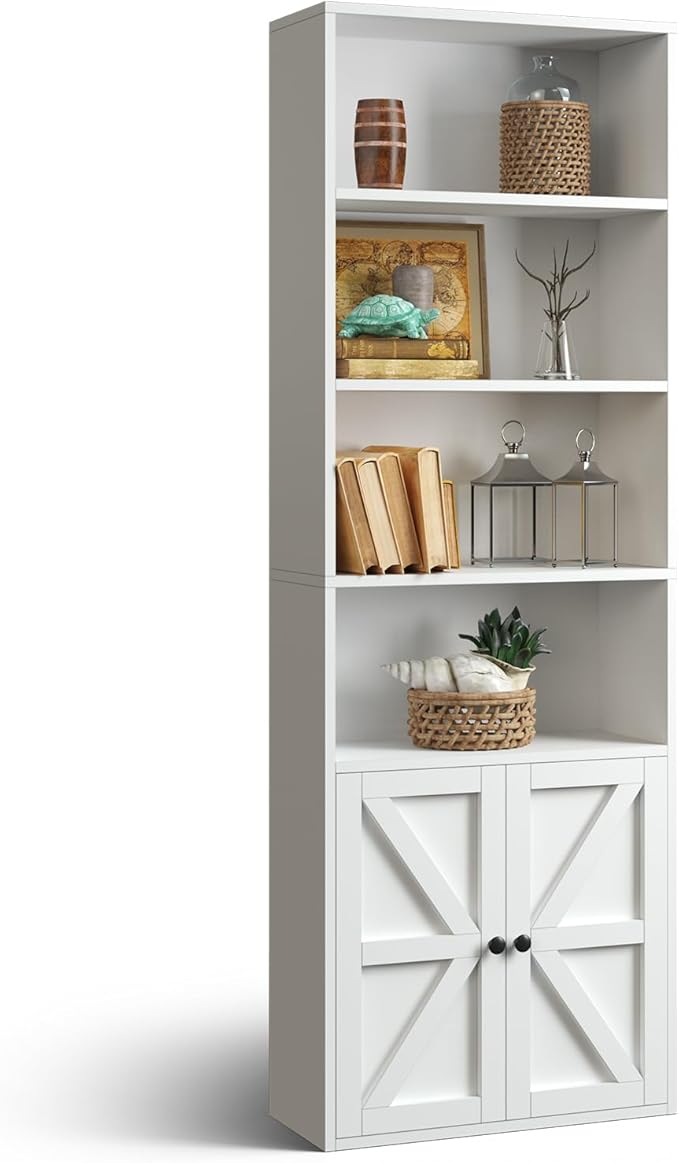 oneinmil 6 Tier Bookshelf and Bookcase, Wooden Bookshelves with Cabinet Doors, Floor Bookshelves and Office Storage Cabinets for Home Office, Living Room,White