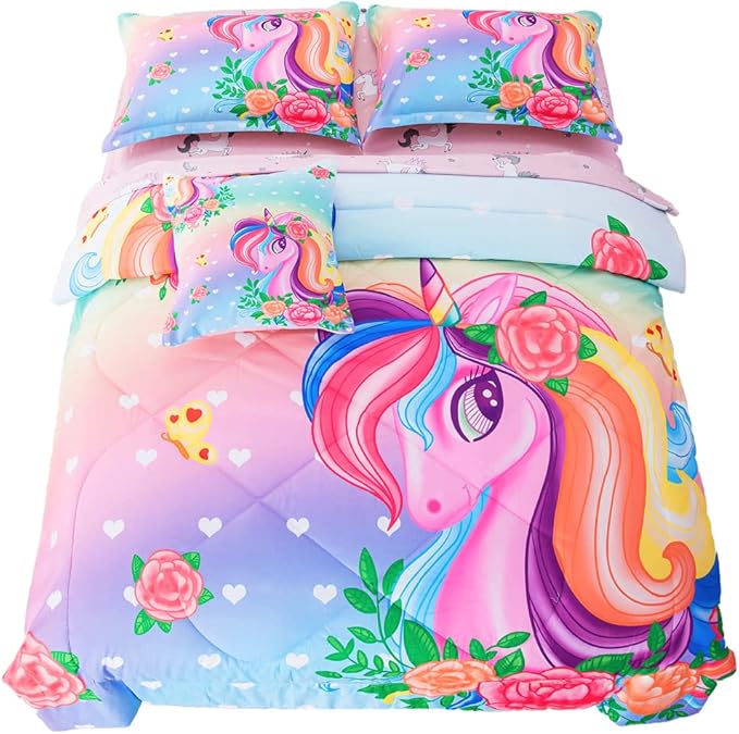 ADASMILE A & S Unicorn Comforter Set Full with Sheets 6 Pieces Floral Pink Unicorn Bedding Set for Girls Kids Unicorn Sheets Soft Bed-in-a-Bag Comforter Reversible Bed Comforter Set for Home Decor