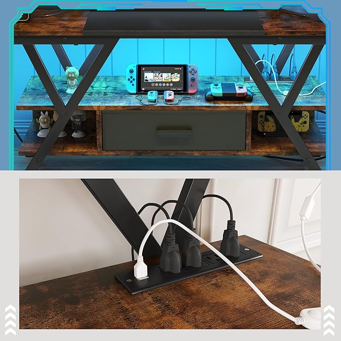 Yusong 65 inch LED TV Stand, Entertainment Center Gaming TV Table with Outlets, Up to 65" Media Console for Living Room, 29+DIY Dynamic RGB Modes, Rustic Brown and Black
