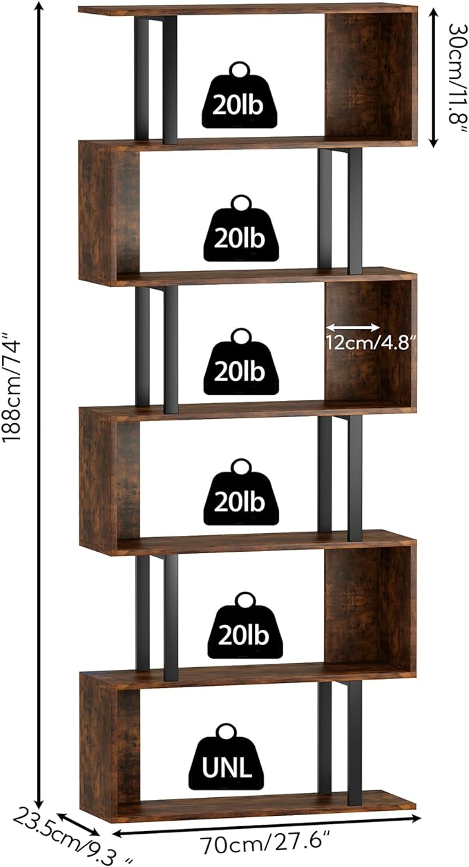 About This 【Overall Dimensions】27.6”x 9.3”x 74"(L x W x H), providing enough space for displaying. 【Modern S-shaped Bookshelf】Unique Geometric Design...