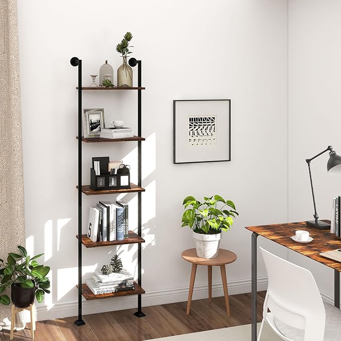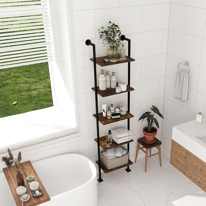 Axeman 5-Tier Ladder Shelf, Tall Narrow Bookcase for Small Spaces, Book Storage Organizer Case for Living Room, Home Office, Study, Industrial Style Black Metal Frame and Rustic Brown Shelf