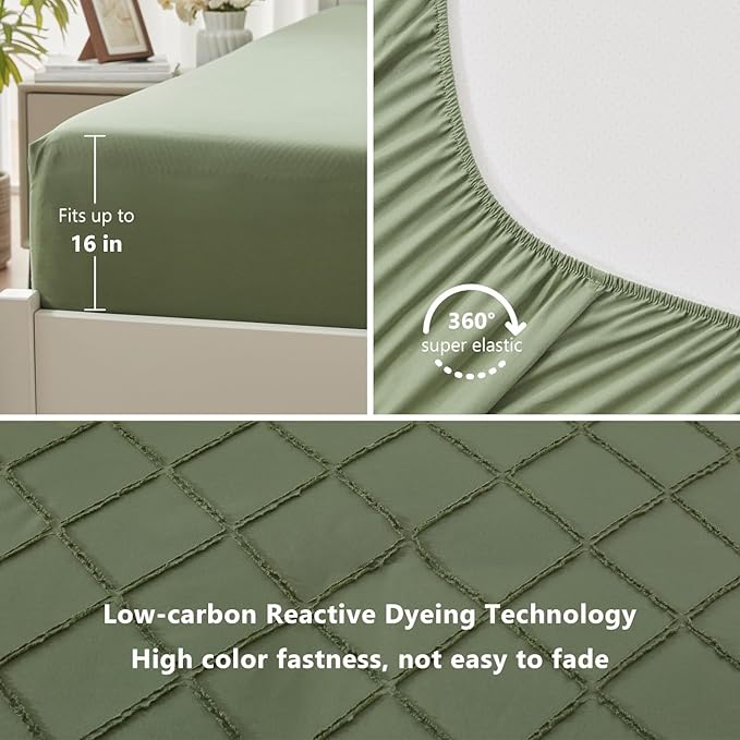Boho Olive Green Comforter Set with Jacquard Tufted Design,Shabby Chic Bedding Sets for All Seasons,5 Pieces Twin Dorm Bed in a Bag Comforter,Flat Sheet,Fitted Sheet,Pillowcases & Shams