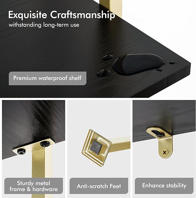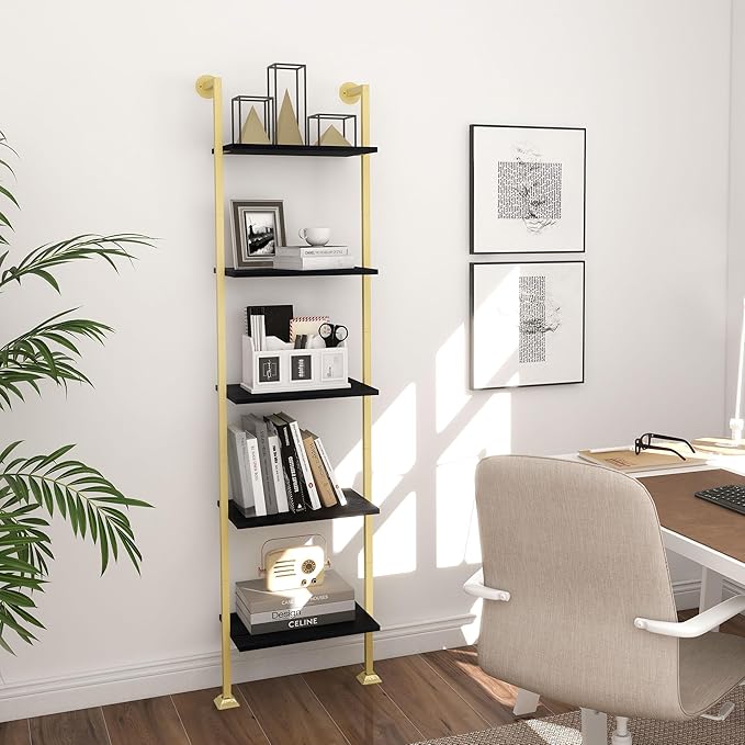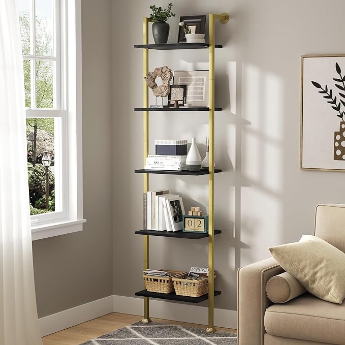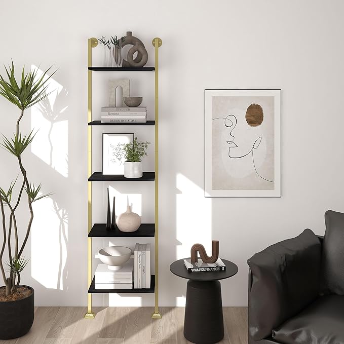 Axeman 5-Tier Ladder Bookcase, Tall Narrow Bookshelf for Small Spaces, Modern Book Storage Organizer Case Open Shelves for Bedroom, Living Room, Office, Library, Gold Metal Frame and Blakc Shelf