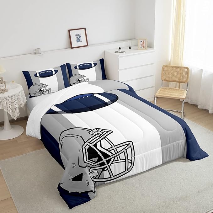 Feelyou Kids Football Comforter Set Queen Size Rugby Sports Bedding Set for Boys Teens Decor Soccer Ball Game Comforter American Football Grey Blue Duvet Set Quilt 3Pcs Boys