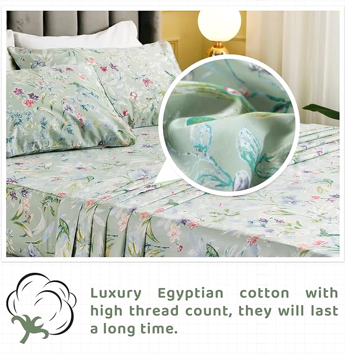 QSH 100% Cotton Sheets for Split King Size Bed, Pattern Botanical Luxury Cotton Printed Floral Bedding Sheets Soft and Breathable 5pcs Deep Pocket Queen Sheet Set