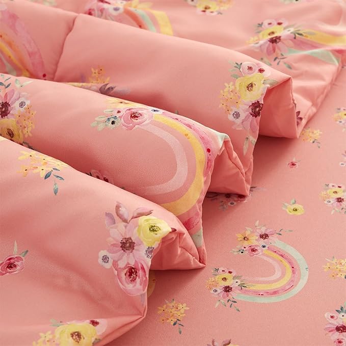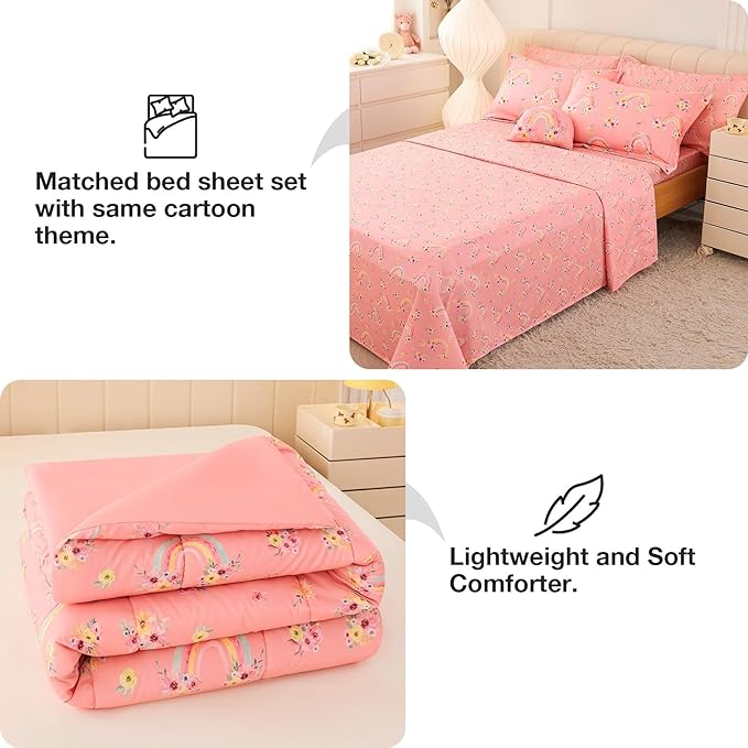 Mooreeke Twin Size Comforter Sets for Girls Kids, 6 Pieces Bed in a Bag Pink Rainbow Flowers Bedding Comforter Sheet Set with Shams and Decorative Toy Pillow, Ultral Soft Microfiber Kids Bed Set