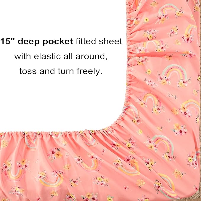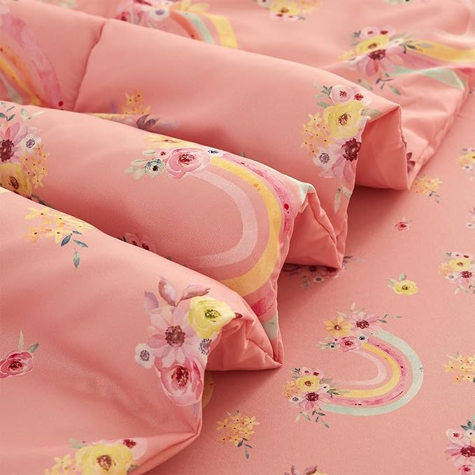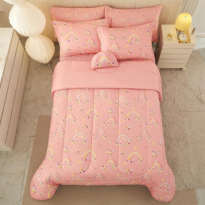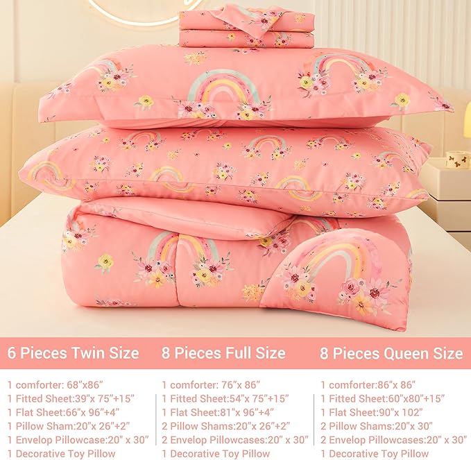Mooreeke Full Size Comforter Sets for Girls Kids, 8 Pieces Bed in a Bag Pink Rainbow Flowers Bedding Comforter Sheet Set with Shams and Decorative Toy Pillow, Ultral Soft Microfiber Kids Bed Set