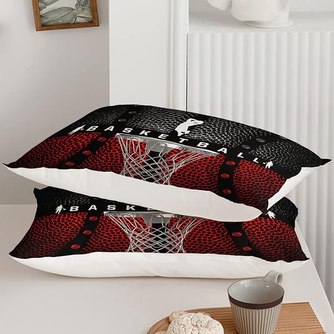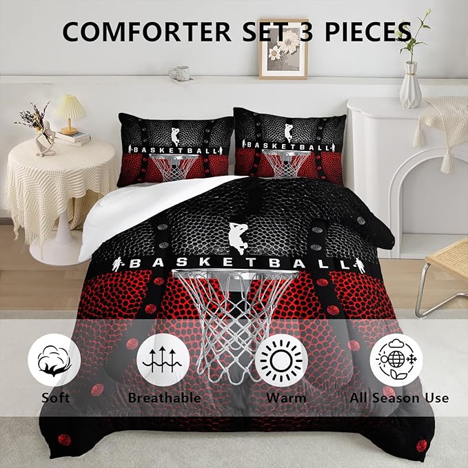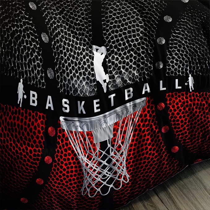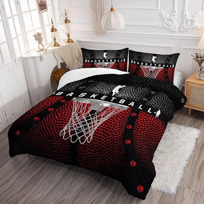 Axolotl Basketball Bedding Set for Boys Kids Teens,Soft Microfiber Black and Red Sports Theme Basketball Bedding Sets Queen Size with 1 Comforter and 2 Pillowcases All Season