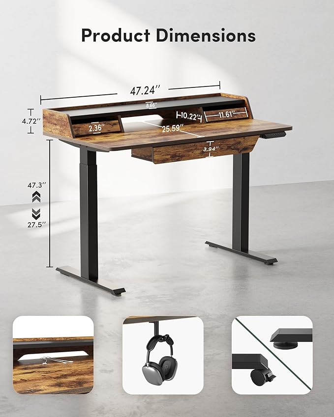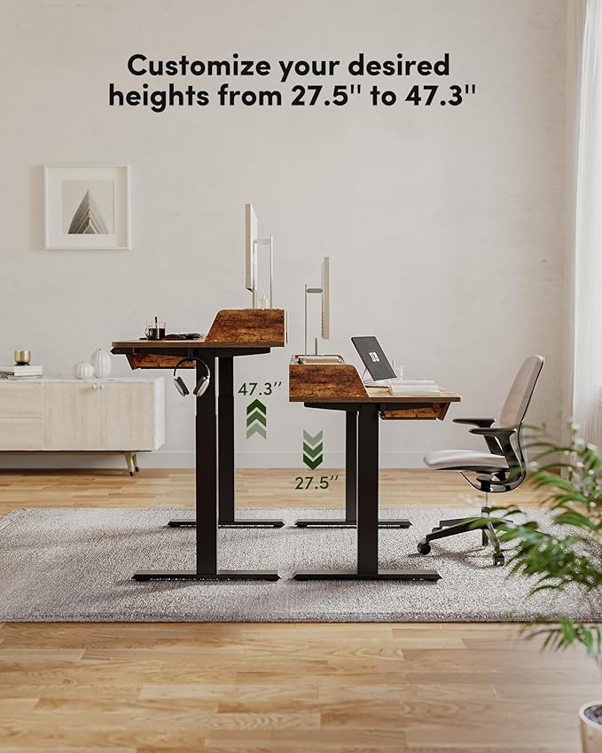 BANTI 48 x 24 Inch Electric Standing Desk with 3 Drawers, Adjustable Height Stand Up Desk, Sit Stand Home Office Desk with Storage Shelf, Rustic Brown Top