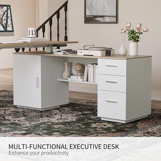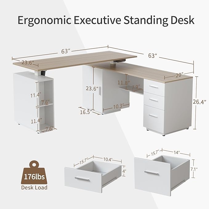 FEZIBO 63" L Shaped Executive Standing Desk with 3-Drawer File Cabinet, Electric Height Adjustable Stand up Desk for Home Office, Computer Desk with Storage Cabinets, White Frame Light Walnut Top