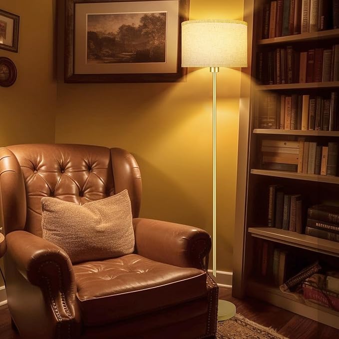 Gold Floor Lamps for Living Room, Bright Standing Lamp with 3 Color Temperatures(9W Bulb), Beige Linen Lampshade, Foot Switch, Simple Reading Floor Lamps Tall Lamps for Bedroom/Office/Den/Classroom