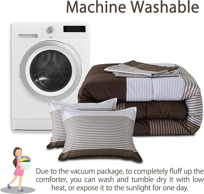 Andency Stripe Comforter Set Twin Size (66x90 Inch), 2 Pieces Brown Patchwork Striped Comforter, Soft Microfiber Down Alternative Comforter Bedding Set with Corner Loops