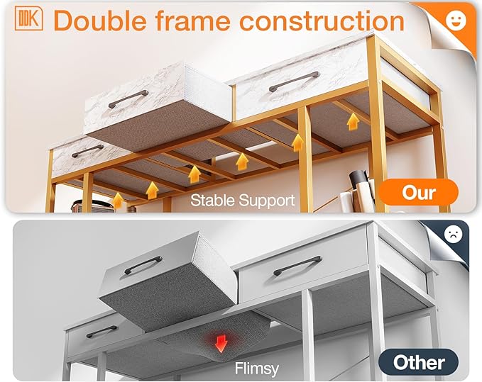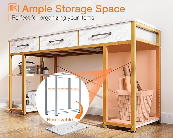 ODK Vanity Desk with Fabric Drawers & Storage Shelves, Makeup Dressing Table, Home Office Desks for Bedroom, Modern Writing Desk,White Marble and Gold Leg, 48"x16" (No Mirror)