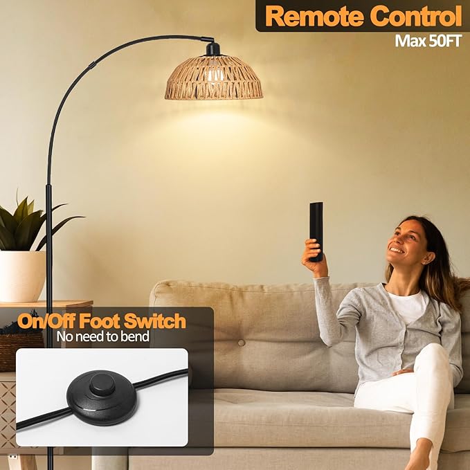 Boho Floor Lamp with Remote- Arc Tall Lamps, Bronze Floor Lamps with Stepless Dimmable Bulb, Hand-Worked Adjustable Rattan Lampshades, Brown Rattan Standing Lamp