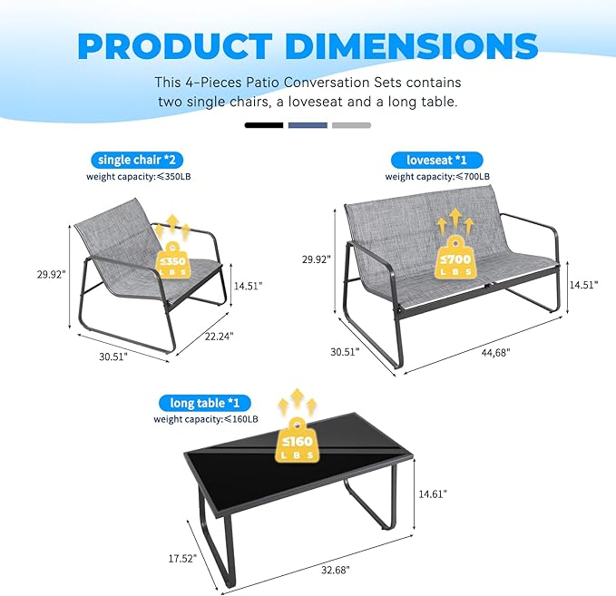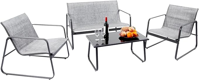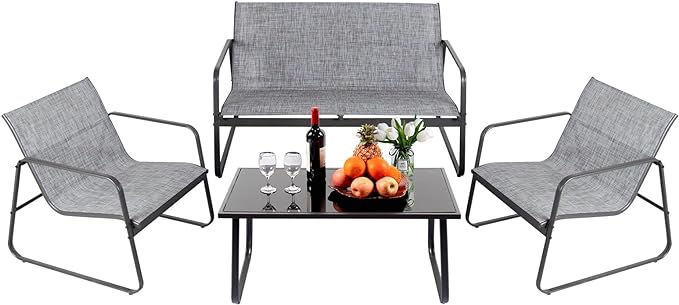 4 Piece Patio Outdoor Furniture Set with Strong Powder Coated Metal Frame One Love Seat, Two Single Chairs and one Table for Porch, Balcony, Backyad, Patio Conversation Set (Grey)