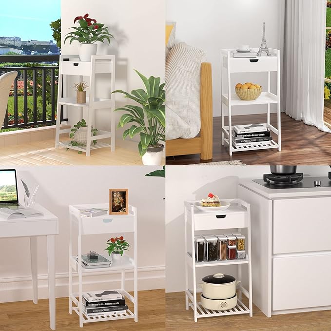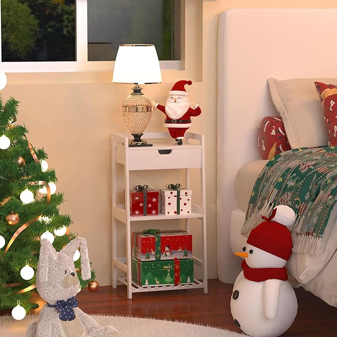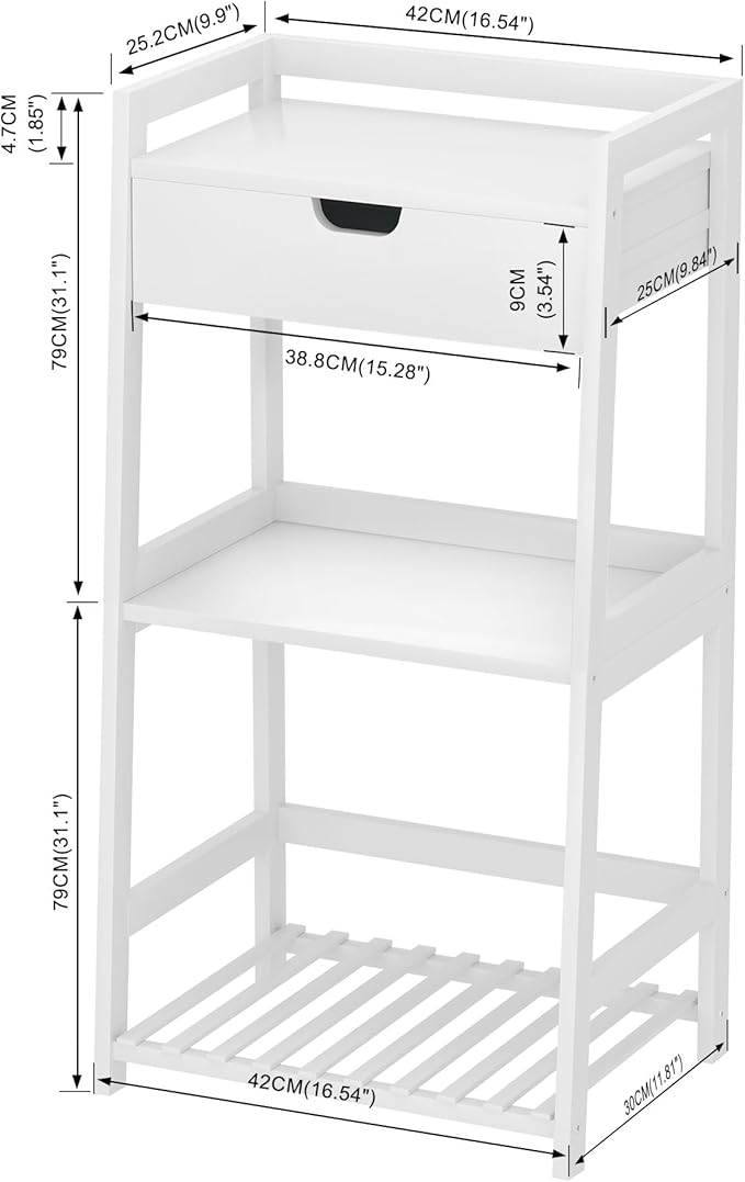 Bathroom Shelves, 3 Tier Ladder Shelf with Drawers, Bamboo Bookshelf Open Shelving, Nightstand Bookcase End Table Plant Stand for Living Room, Bedroom, Bathroom, Kitchen