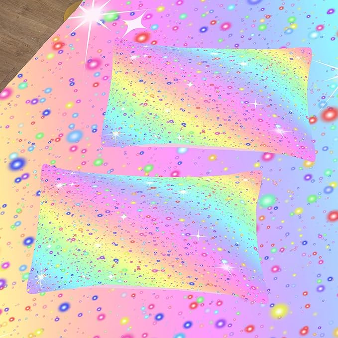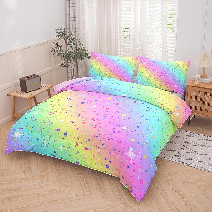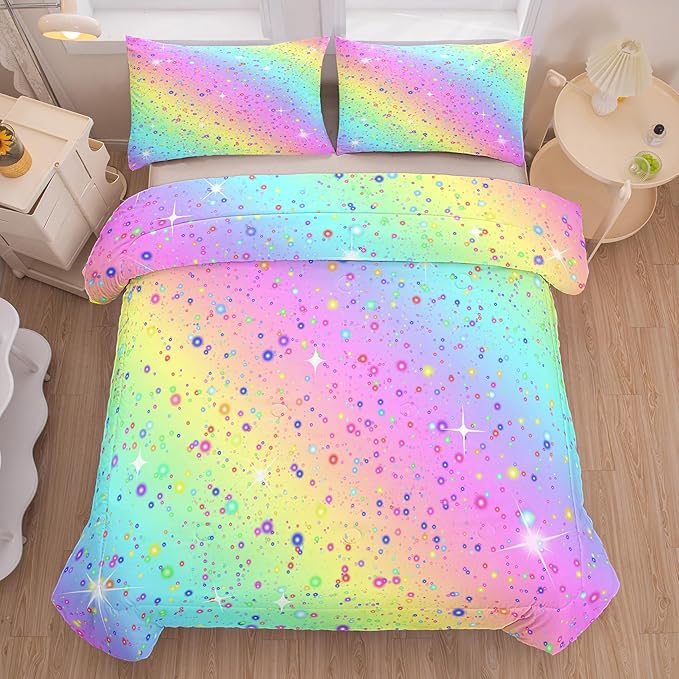 Girls Comforter Set Queen, Rainbow Bedding Set, Galaxy Twinkle Bedding for Kids Teens, Colorful Pastel Bedding Set, 5 pcs Bed in A Bag Queen, Kids Princess Bedding Set for Girls