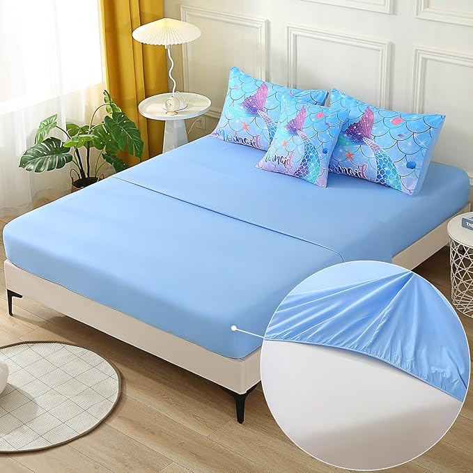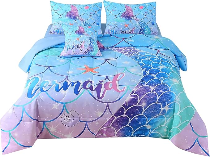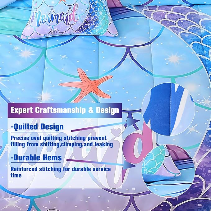 JQinHome Mermaid Comforter Set Twin Size, 6 Piece Mermaid Tail Bed in A Bag,3D Colorful Mermaid Bedding Set for Girls Kids, Sparkle Teal Bedroom Decor Bedding Set with Sheets (Blue)