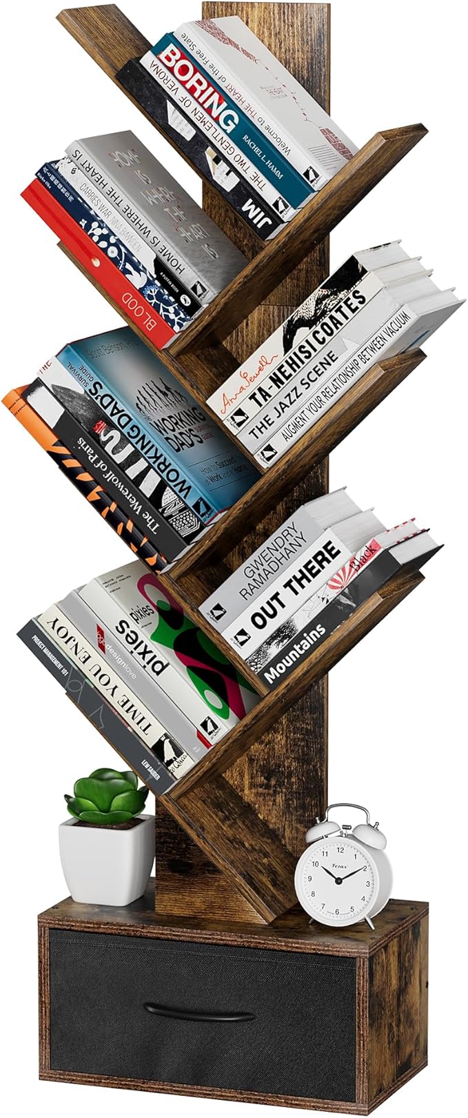 Egepon 6-tier Tree Bookshelf with Drawer Rustic Brown Book Shelf Storage Rack Floor Standing Bookcase for CDs Movies Books Multifunctional Organizer Shelves for Home Office Living Room Bedroom