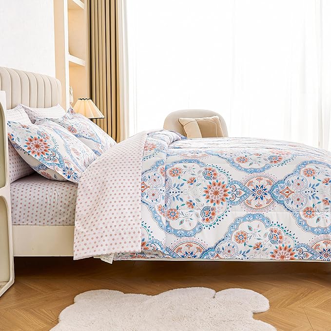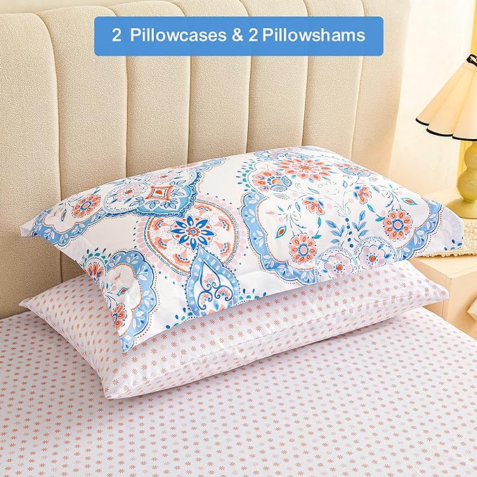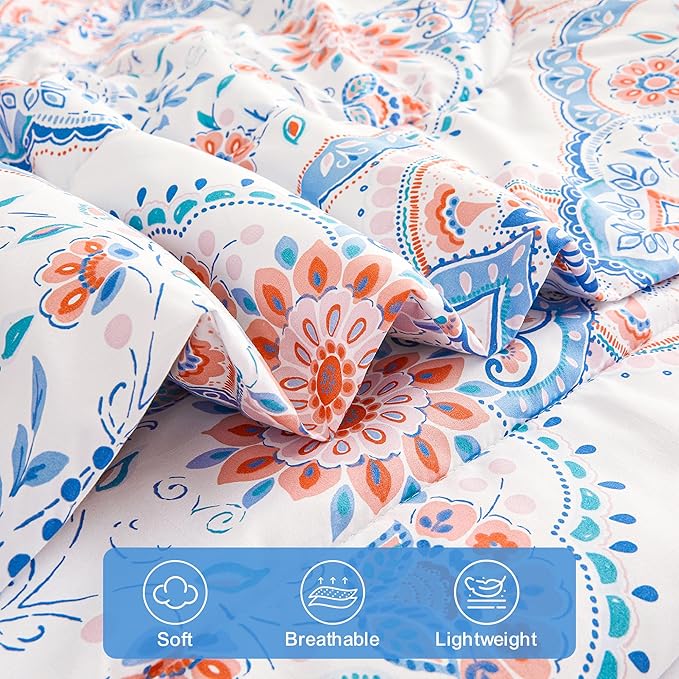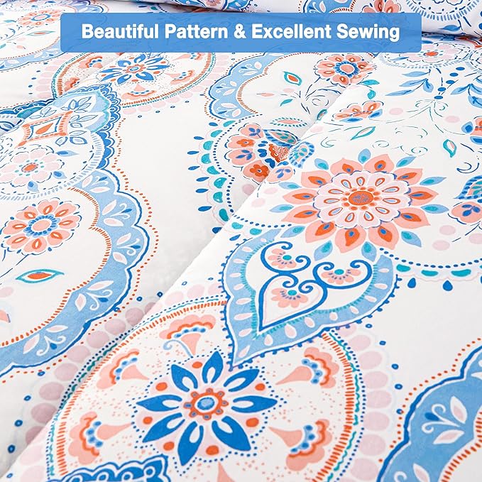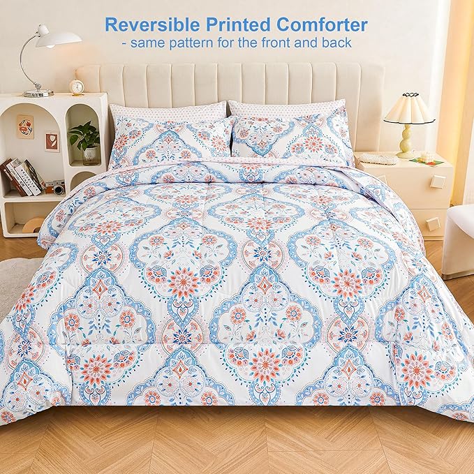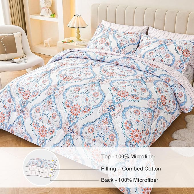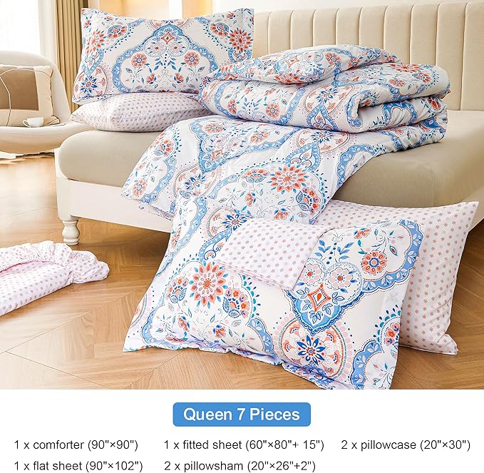 Printed Queen Bedding Sets with Comforter and Sheets, Lightweight Boho Floral 7 Piece Bed in A Bag Comforter Set for Women, Pink and Blue Mandala Flower Pattern