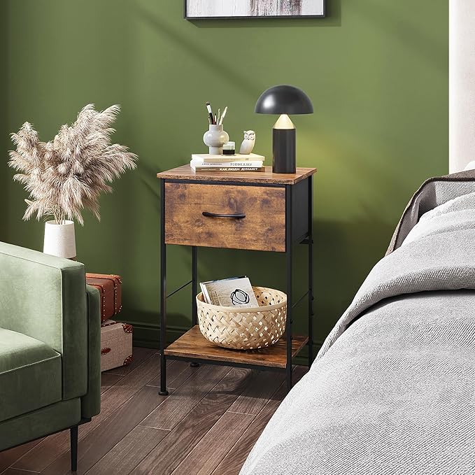 WLIVE Nightstand, Bedside Side Table for Bedroom, Dorm with Steel Frame, Night Stand End Table with Fabric Storage Drawer, Easy Assembly, Rustic Brown Wood Grain Print, 11.8''D 15.8''W 24.9" H