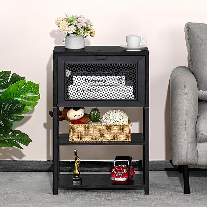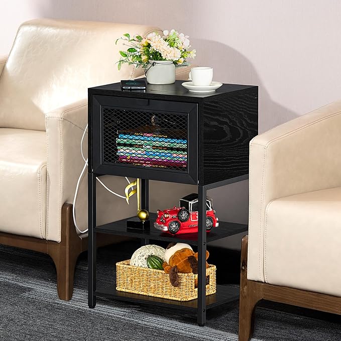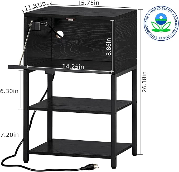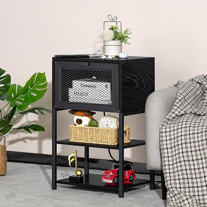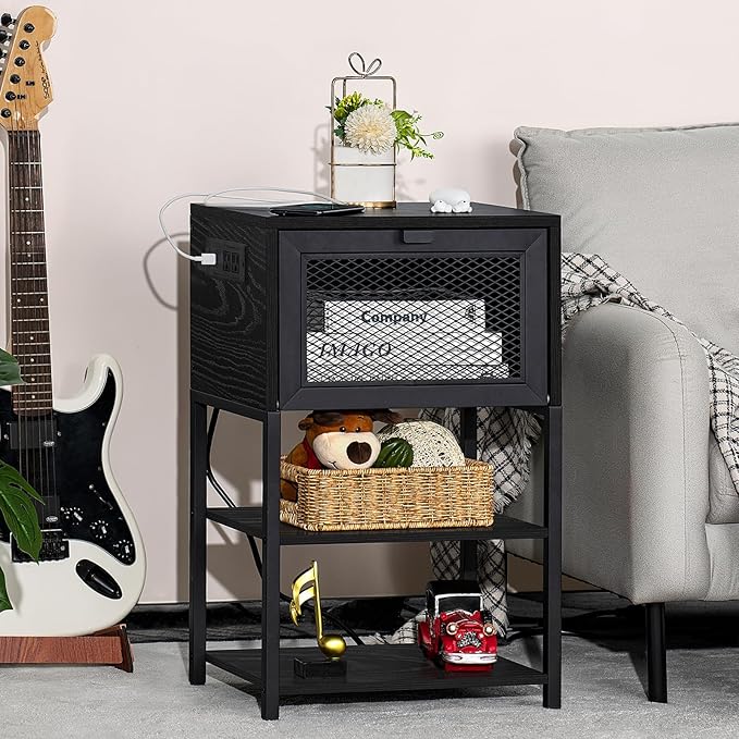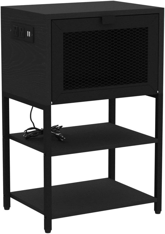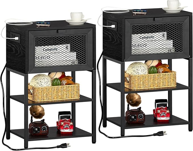 Black Nightstands Set of 2 with Charging Station and USB Port, 3 Tier Industrial Night Stand, Bedside Table with Flip Storage Drawer and Open Shelf, End Side Table for Bedroom, Office, Dorm