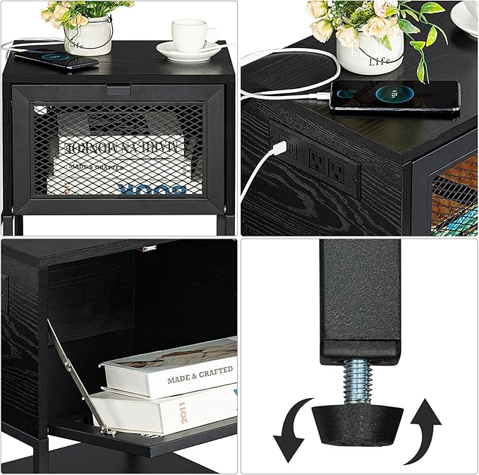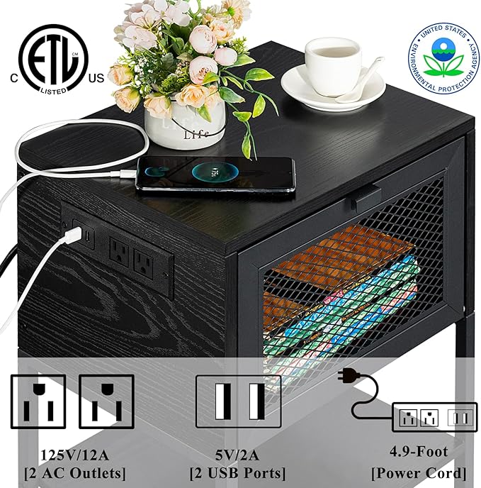 About This 【Black Nightstand set of 2】: The side table with charging station can be used as couch side table,...