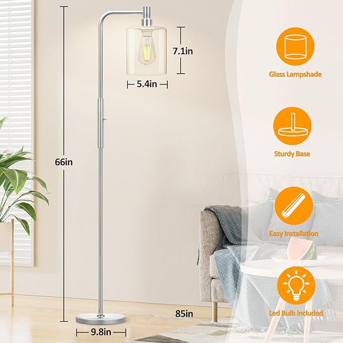 Stepless Dimmable Floor Lamps with Glass Lampshade Modern Standing Lamps with 6W LED Bulb Bright Corner Lamp Tall Pole Lamps for Living Room Bedroom Office Study Room Farmhouse, Silver