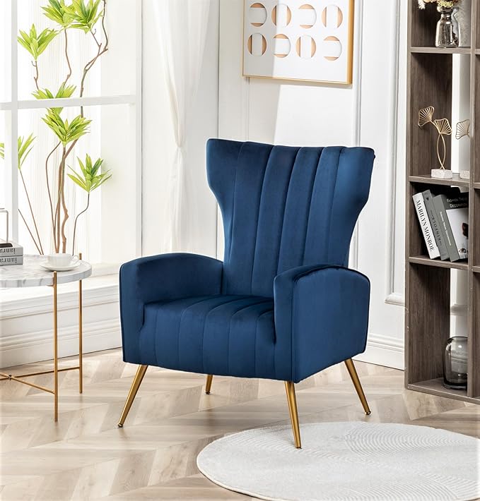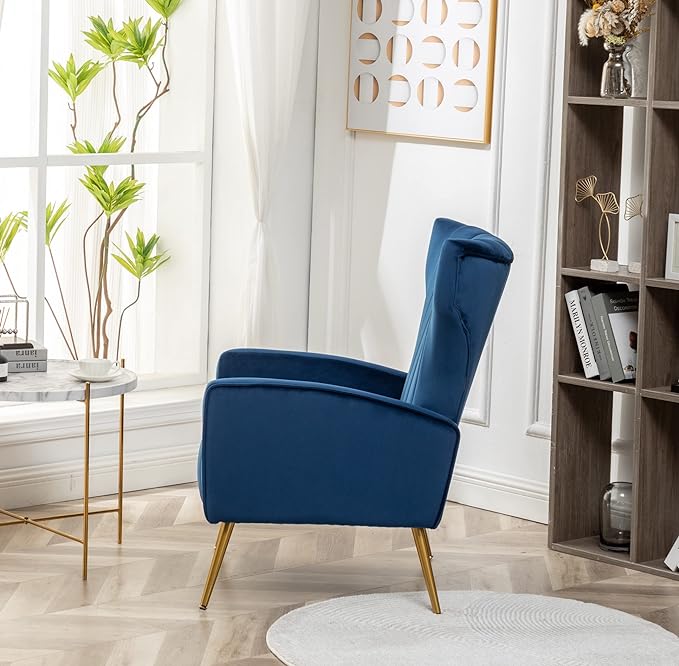 Armchair Modern Velvet Accent Chair, Channel Tufted Bedroom, Office or Living Room Furniture with Elegant Metal Legs, Blue