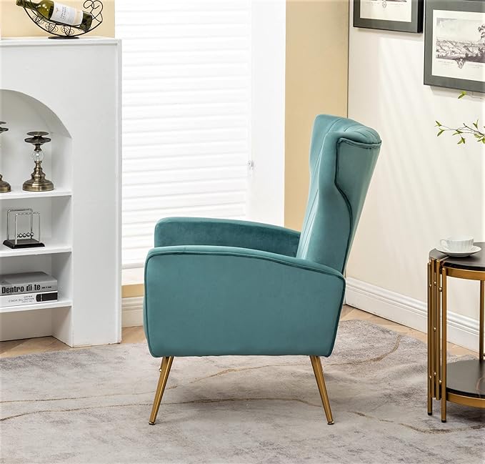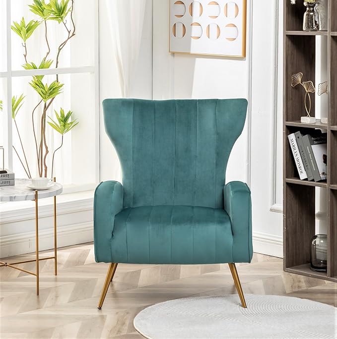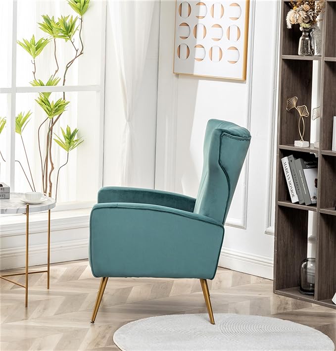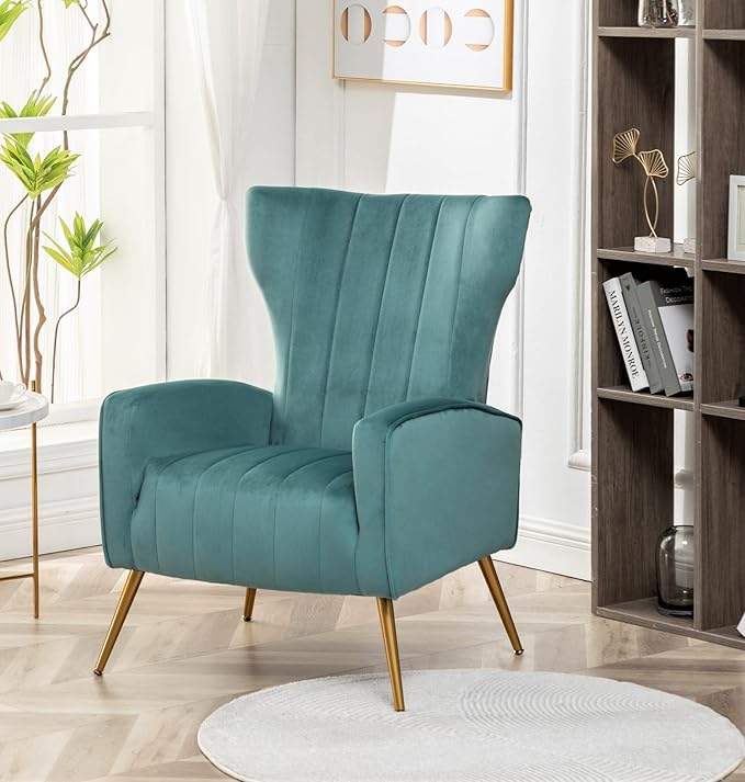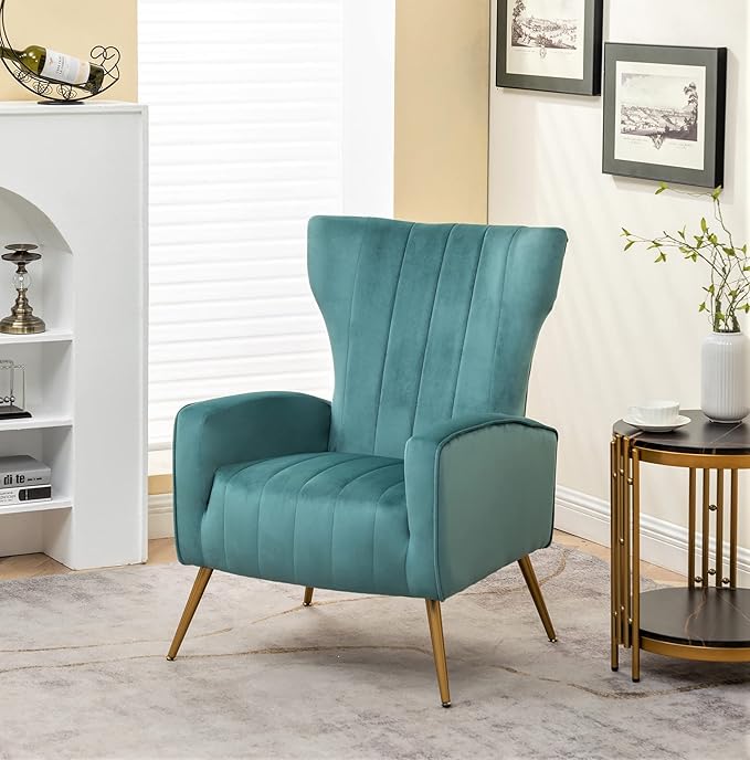 Armchair Modern Velvet Accent Chair, Channel Tufted Bedroom, Office or Living Room Furniture with Elegant Metal Legs, Teal