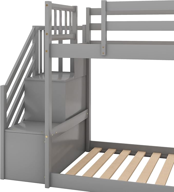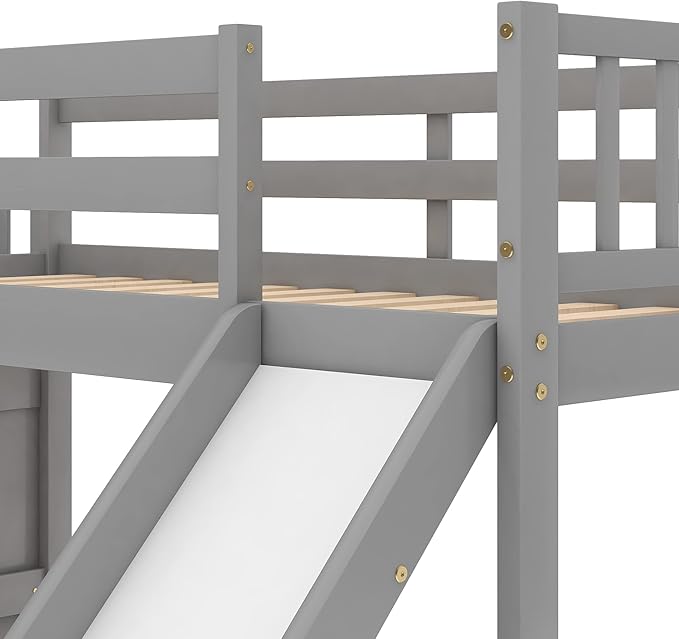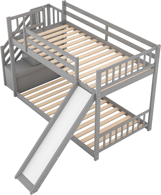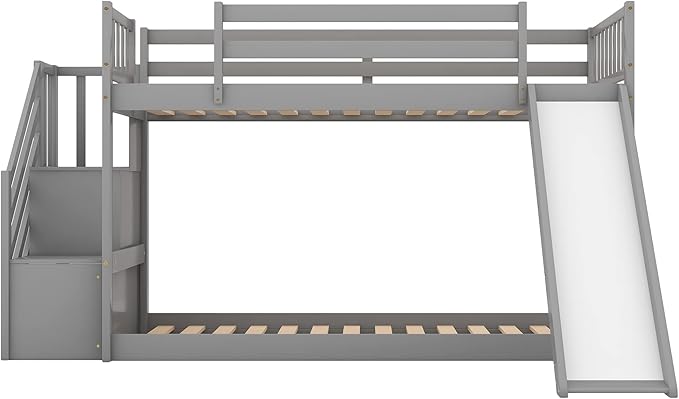 Twin Bunk Bed with Convertible Slide and Stairs, Wooden Low BunkBed Frame for Kids Teens Bedroom, Dorm, Gray