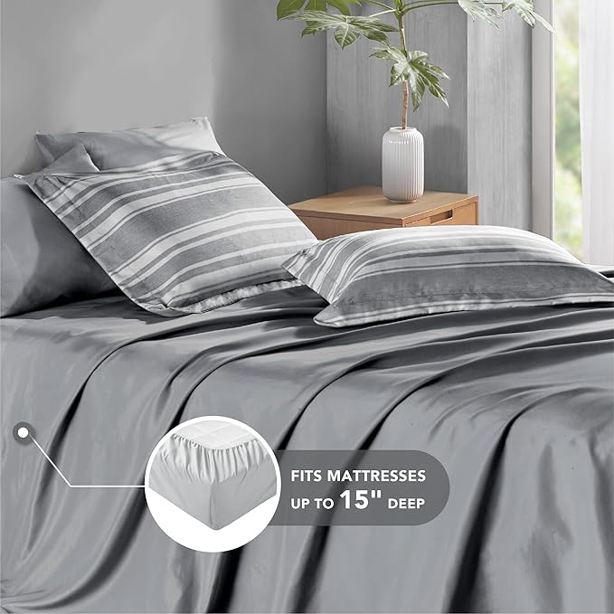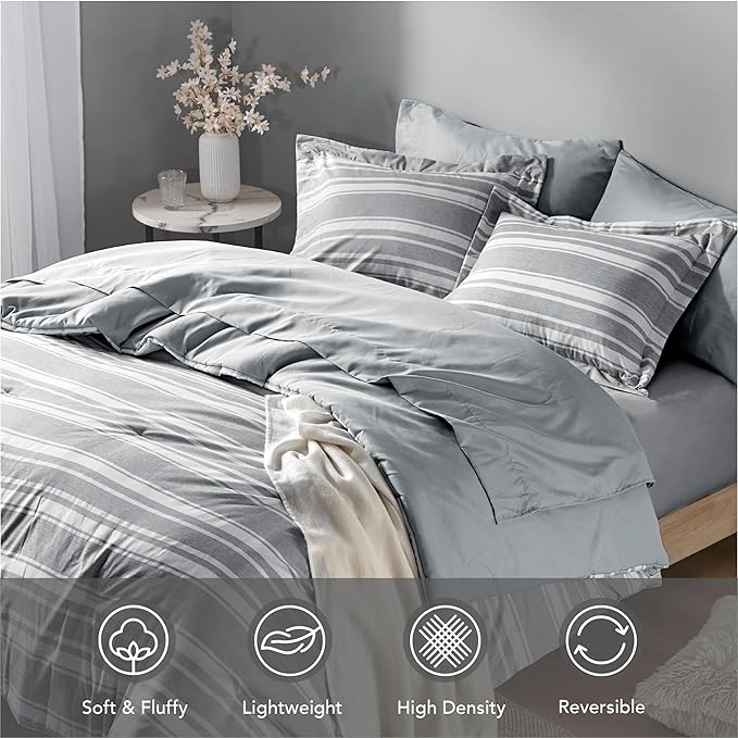 King Size Bed in a Bag, Full Bedding Sets, Modern Farmhouse Grey and White Striped Comforter with Sheets, 7-Piece Complete Bedroom Set