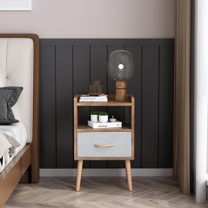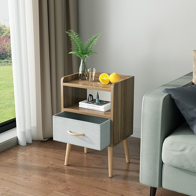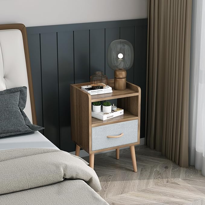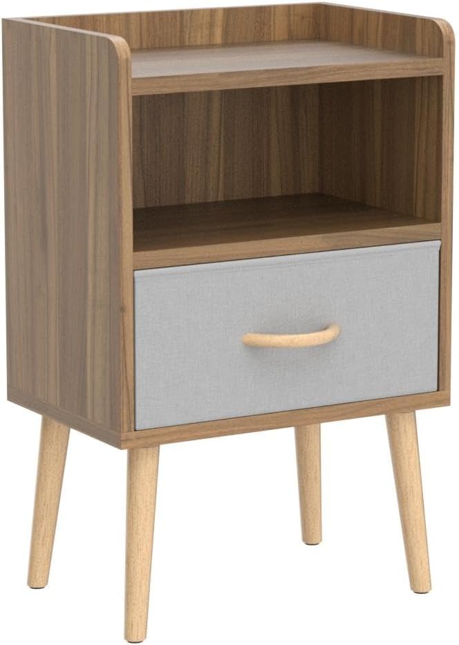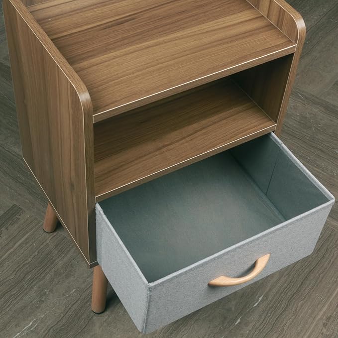 LUCKNOCK NightStand with Fabric Drawer, Bedside Table with Solid Wood Legs, Minimalist and Practical End Side Table with Open Storage Shelf for Bedroom,Walnut.