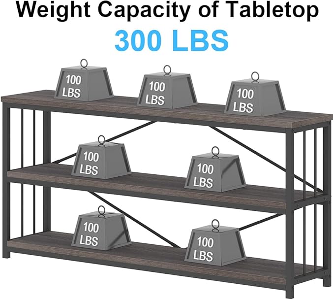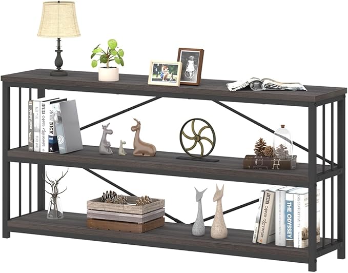 IBF Wood and Metal Book Shelf, Industrial Rustic Low 3 Tier Bookshelf, Farmhouse Long Wide Vintage Horizontal Bookcase, Modern Large Open Etagere for Home Office Living Room Bedroom, Gray Oak, 63 Inch