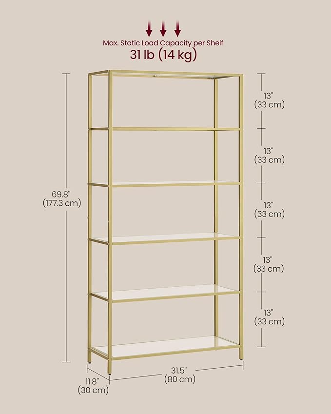 VASAGLE Bookcase, 6-Tier Bookshelf, Slim Shelving Unit for Bedroom, Bathroom, Home Office, Tempered Glass, Steel Frame, Metallic Gold ULGT503A01