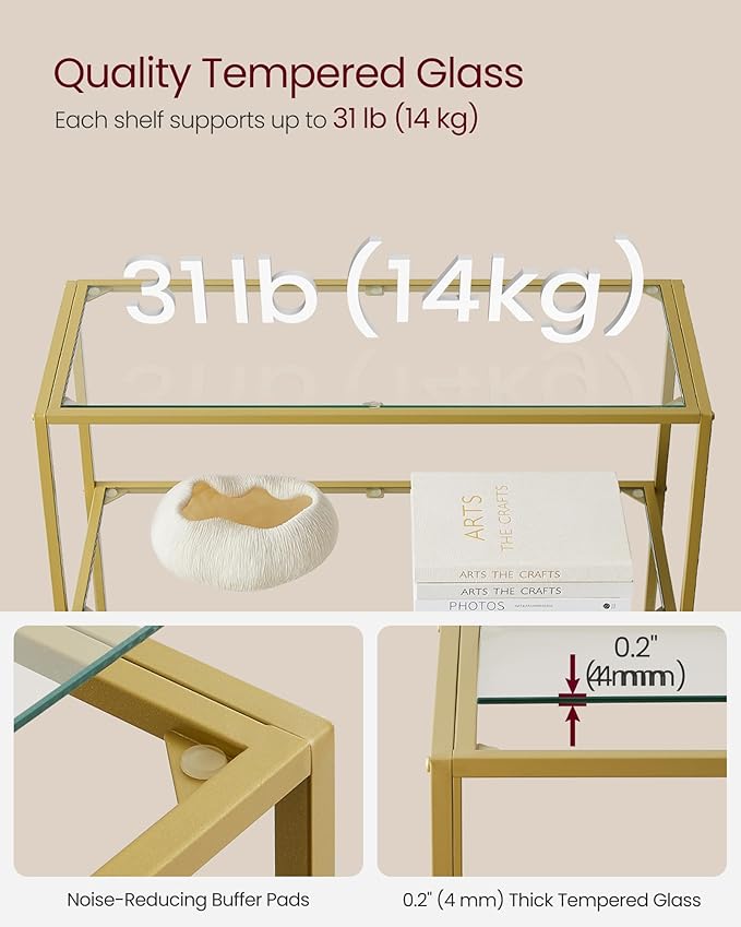 About This [Display Your Faves] With transparent glass shelves and a gold-colored frame, this 6-tier shelf boasts stunning modern minimalism....